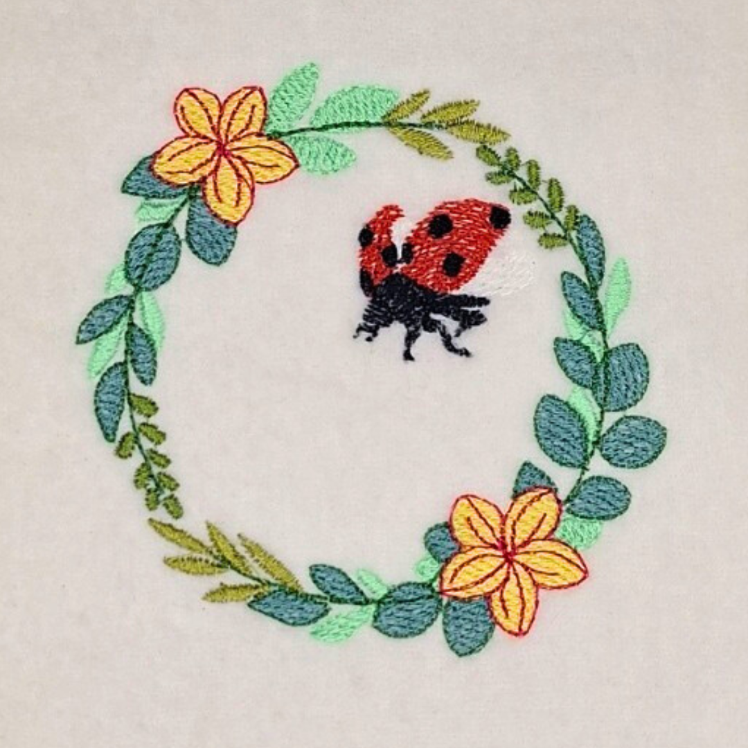 Add a touch of nature to your home or craft charming items like tote bags, scatter cushions, table cloths, tea towels, and more using this Ladybird in Flight Machine Embroidery Design. The vivid insects and blossoms will never fail to impress. This whimsical Flying Ladybird in a floral wreath captures the essence of movement and breathes life into this delightful design.