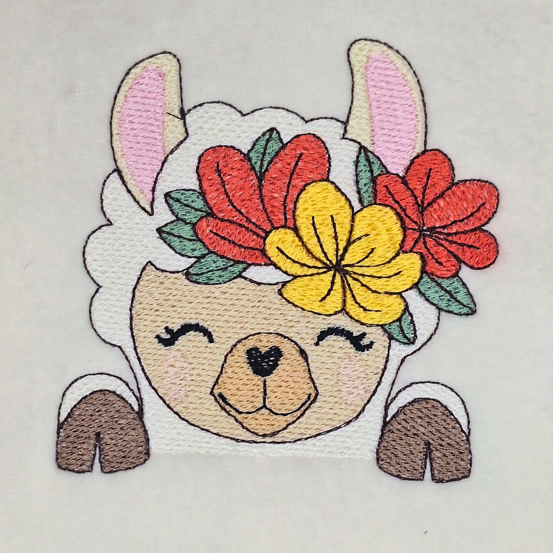 Add this adorable Baby Llama with Flowers Machine Embroidery Design to your collection for little girls' t-shirts, and baby onesies, blankets, and burp cloths.