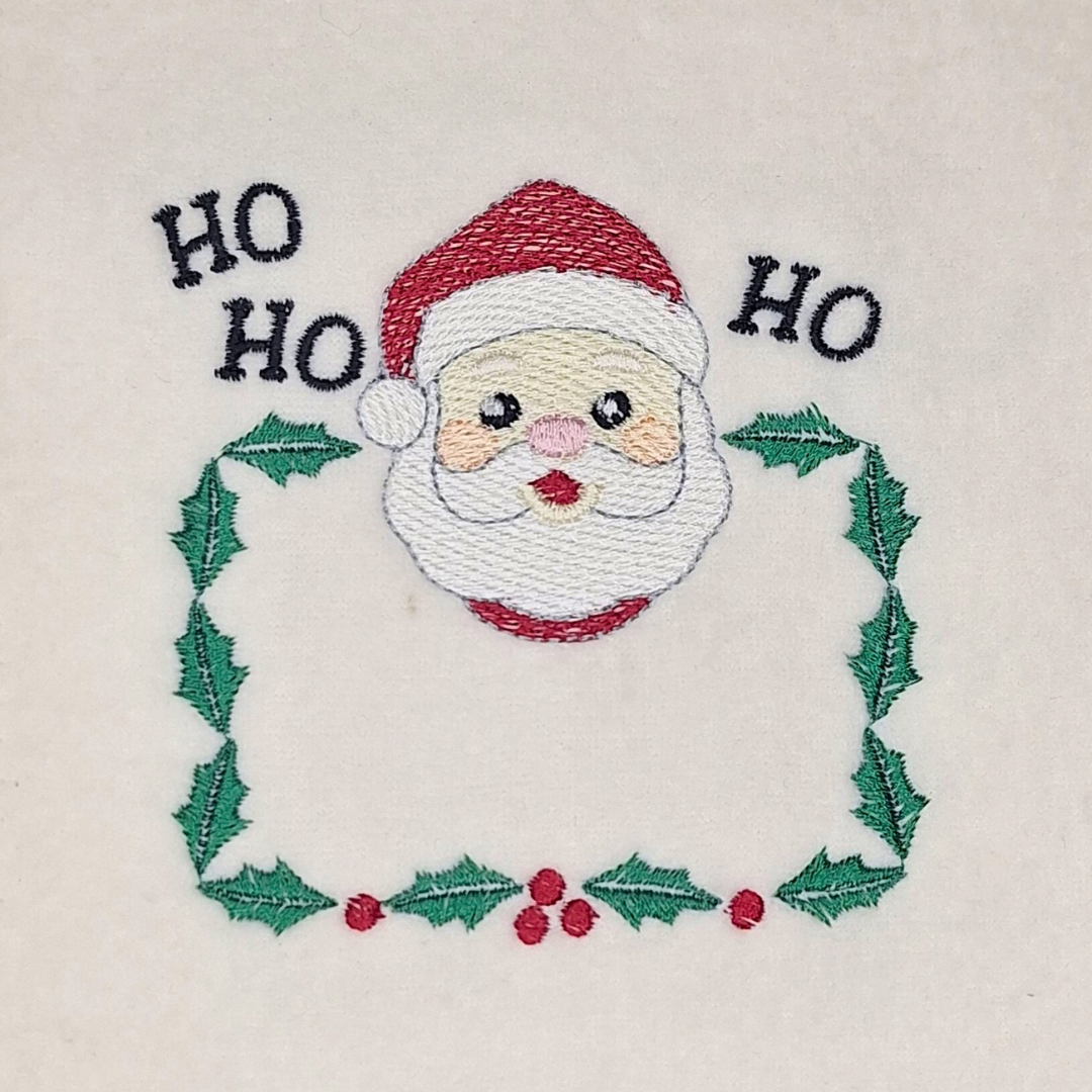 Make your holiday decor and gifts extra special with this festive Santa Clause in a Holly Leaf Frame machine embroidery design. Personalize with your own text or name for a jolly touch!